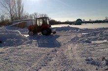 После обильных снегопадов школьный трактор чистит территорию школы.