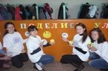 Сегодня каждого входящего в школу встречали члены отряда "Тайфун" республиканского проекта "СМС - дети". Они проводили ежегодную акцию "Поделись улыбкой!" и раздавали всем смайлики.