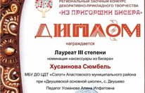 Региональный заочный конкурс декоративно- прикладного творчества "Из пригоршни бисера". Обьединение "Рукоделие" (рук.Мифтахова Флорида Фасхитдиновна) лаурет II степени в номинации "Нашейные украшения" . Поздравляем!!!