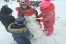 Лепит с самого утраДетвора снеговика.Снежные шары катаетИ смеясь, соединяет.С детьми старшей группы с удовольствием слепили первого в этом году снеговика!такая совместная деятельность сплачивает детский коллектив и приносит им радость! -