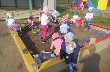 Дети сегодня на прогулке не только резвились и играли, но и помогали взрослым в посадке саженцев петуний.Цель: детям показать пример уважительного отношения к труду и природе. Воспитывать трудолюбие.