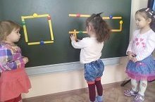 Сегодня дети на занятии по математике " Интересные фигуры", познакомились еще с одной геометрической фигурой: "прямоугольник".Ребята, выкладывая из коротких и длинных полосок геометрические фигуры: квадрат и прямоугольник, учились находить сходства и различия предметов по форме. -
