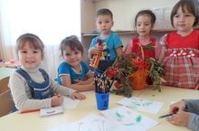 Мы, с ребятами, провели наблюдение осенних явлений в природе. Рассматривали кустарники и деревья, раскрашенные осенью. Рисовали гроздья рябины.