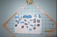 Тема образовательной работы 29 недели «Что там в небе голубом». Поэтому в 1 смешанной группе прошло занятие на тему: «Живые облака». Дети выполняли аппликацию с использованием обрывной техники. Готовые облака они наклеивали на «небо» образуя большую красивую картинку.