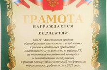 Школа была награждена грамотой отдела образования Исполкома Апастовского муниципального района 19.09.2025
