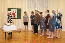 На занятии ребята познакомились с различными жанрами народного фольклора: колыбельными песнями, считалками, пословицами и поговорками, загадками, частушками. Отдельное внимание было уделено элементам национальной татарской одежды и головным уборам. Дети с интересом приняли участие в татарской игре «Түбәтәй». Завершился классный час инсценировкой татарской сказки «Шалкан». -