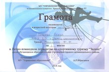 В январе 2018 года в Арском МБУ «Дворец школьников» прошли соревнования в Личном-командном первенстве по спортивному туризму «Залинг» среди обучающихся образовательных учреждений Арского муниципального района, в которой приняли активное участие учащиеся нашей школы. За достойное выступление и высокий результат ученики 6 класса Гараева А. и Галимуллин Р. награждены грамотами за 1 место. Поздравляем!