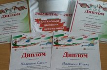 26 мая 2017г. в театре кукол «Экият» г. Казань состоялось награждение самых активных участников республиканского проекта «Культурный дневник школьника». Победителями конкурса среди школьников 1-4 классов в номинации «Лучший культурный дневник школьника» стали ученики 1А класса Надршин С.и Надршин И. А их мама Надршина Р.Г. стала победителем конкурса родителей в номинации «Самый культурный дневник». Победителям вручены дипломы, памятные подарки, билеты на посещение парка «Кырлай» и приглашены на представление в кукольный театр «Экият».