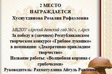 Наши воспитанники не перестают нас радовать! Поздравляем Хуснутдинову Розалию - воспитанницу подготовительной группы № 2 с победой в Республиканском творческом конкурсе "Грибное лукошко" в номинации "Декоративно-прикладное творчество"