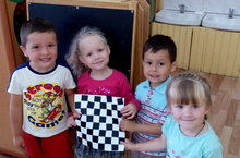 20 июля - Международный день шахмат. Воспитаннки средней группы познакомились с новой игрой, историей её возникновения. Во время беседы дети узнали, что в этой игре, как и в других спортивных играх, игроки сревнуются, но только не в силе и скорости, а в смекалке, находчивости, в быстроте ума. В завершении дети выполнили коллективную аппликацию "Шахматная доска".