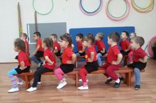 Сегодня дети младшей группы выполняли упражнения сидя на гимнастических скамейках. В конце занятия играли в игру "Кот и воробушки".