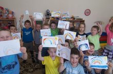 Пр. сод.: Учить создавать образ природного явления "радуги". Развивать эстетические чувства: чувства цвета, композиции. Учить радоваться созданному. Формировать желание создавать полезное, красивое. Разучить стижок - пожсказку расположение цветов радуги. "Каждый охотник желает знать, где сидит фазан.