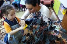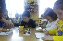 Икенче кечкенәләр төркеменә йөрүче балалар "Көзге яфраклар" дигән темага рәсем ясадылар.Сары, кишер сары, кызыл төсләрне аера белергә өйрәнделәр. Балаларга кисточка һәм краска белән ясау бик ошады. Ахырдан әти-әниләр өчен балаларның рәсемнәреннән "Көзге яфраклар" дигән күргәзмә ясалды.