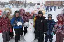 Дети старшей группы №1 очень любят прогулки, они не только играют на улице, а убирают мусор, сухие ветки, чистят от снега тропинки, подметают. А так же любимое занятие детей - лепить из снега снеговика и строить снежные постройки. Сегодня тоже они украсили участок детского сада своим снеговиком, которого все дружно слепили.