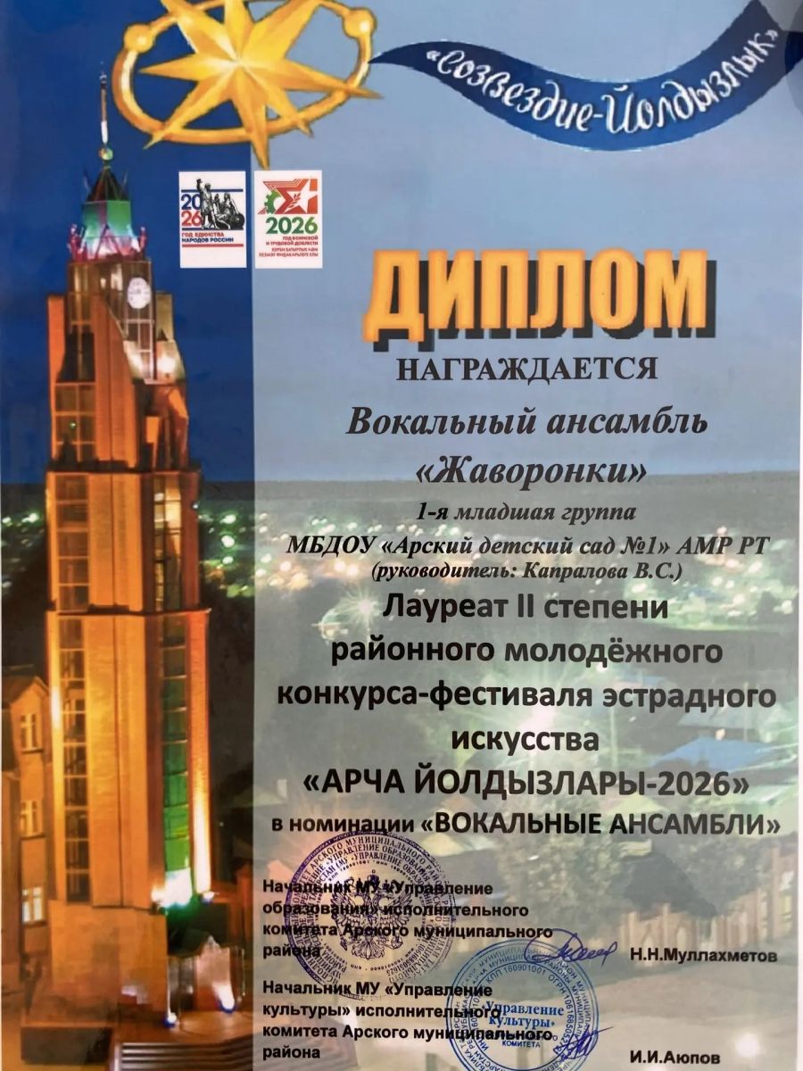 2025-2026 у.г.:Веселые старты-2025, 1 место.jpg, Благодарственое письмо, библиотека.jpg, Герои татарских сказок и мультфильмов, Габделбариева З_, 1 место.jpg, Здоровое будущее, Габделбариева З, 1 место.jpg, Туган телем - серле телем, Хабибуллин Аяз, 2 место.jpg, Как хорошо уметь читать, Габделбариева З.jpg, Всегда с мамой, Хайдарзянова Г, 1 место.jpg, Нуретдинова Дарина, шашечный турнир 1 место.jpg, Через искусство - к зеленой планете, 2 место.jpg, /Без-Тукайлы халык, Шакирова Р, 1 место.jpg, Счастливое детство, НИзамиева И. А,1 место.jpg, Всероссийский физкультурно-спортивный комплекс ГТО,Гарифуллин Т, Гайнутдинова К, 3 место.jpg, Веселые старты,Сабиров К_,Шагидуллина Я, 1 место.jpg, Ин Милли тэрбияче,Низамиева И_ А, 2 место.bmp, Счастливое детство, Зайнуллина З, 1 место.jpg, Пристань детства, Мифтахова С_Р, 1 место.jpg, Неопалимая Купина, Габделбариева Р.jpg, Нагрудный знак “За заслуги в образовании”, Зиннатова Г_Б.jpeg, Халкыбызның күңел көзгесе, Зиннатова Г_Б, 3 место.jpeg, Фея детства,Зиннатова Г_Б.jpg, Презентация в образовательном процессе, Зиннатова Г_Б_, 1 место.jpeg, Без - Тукайлый халык, Ахметханов Алим.jpeg, Будь заметным на дороге!, Хакимова Амелия, 1 место.jpeg, Герои татарских сказок и мультфильмов, Габдельбариева Элина, 1 место.jpeg, Иң милли тәрбияче - 2025 Зиннатова Г_Б_, 1 место.jpeg, Край родной,навеки любимый,где найдешь ещё такой,Сафиуллина М.jpeg, Неопалимая купина, Ахметгалиева Азалия, 2 место.jpg, Ребенок – главный пассажир, Хамидуллин Алим.jpeg, Фея детства, Шакиров Амир, 3 место.jpg, Я и Красная книга, Набиуллин Ризван.jpeg, Ин милли тэрбияче, Мифтахова С_Р.bmp, Лучший мастер-класс педагога ДОУ, Бахтиярова И_И_,1 место.jpg, Сертификат, выступление Арский д-с 5, Бахтиярова И_И.jpg, Арча йолдызлары, ансамбль.jpg