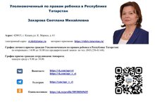 25 сентября 2025 года вступила в должность Захарова Светлана Михайловна - Уполномоченный по правам ребенка в Республике Татарстан.