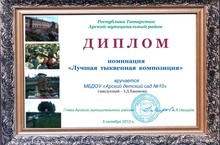 По итогам смотра конкурса, который проводило Управление образования г. Арска коллектив детского сада награджён дипломом в номинации «Лучшая тыквенная композиция» и сертификатом.