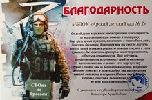 Коллектив, воспитанники нашего детского сада и их родители (законные представители) удостоены Благодарности Волонтеров Арск Победы за поддержку и помощь бойцов в зоне СВО, за организацию встреч воспитанников с волонтерами Победы и воспитание в детях чувства патриотизма и любви к Родине,