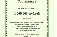 МБДОУ "Арский детский сад №2" стал победителем Республиканского конкурса "Лучший билингвальный детский сад". Был награжден дипломом и получил грант в размере 1 000 000 рублей.