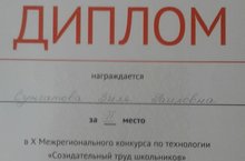 27 октября в городе Елабуга в Елабужском институте КФУ прошел Х Межрегиональный конкурс по технологии "Созидательный труд школьников" среди учащихся образовательных школ, гимназий и лицеев. Ученица 8А класса Сунгатова Зиля была удостоена диплома за 2 призовое место. Молодец! также за подготовку призера была награждена грамотой учитель технологии Ляля Фирдаусовна.