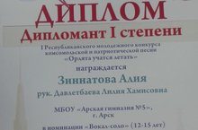 Поздравляем Зиннатову Алию, ученицу 7А класса, дипломанта I степени I Республиканского молодежного конкурса комсомольской и патриотической песни "Орлята учатся летать!" в номинации "Вокал - соло" (12-15 лет).