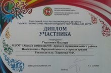 На зональном этапе республиканского детского художественного фестиваля народного творчества "Без бергә" дипломом награждается ученица 7А класса Сиразиева Ильзира в номинации "Народный вокал".