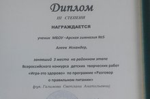 Ученик МБОУ - Арской гимназии №5 Алеев Искандер, занял 3 место на районном этапе Всероссийского конкурса детских творческих работ "Игра - это здорово" по программе "Разговор о правильном питании".