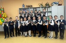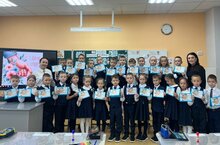 На фото ученики 1 "А" класса (кл.рук. Ибрагимова Э. М.) принесли теплые носочки нашим бойцам. -