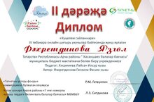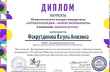 " Мирас чыганаклары" -конкурсы җиңүчесе 31.03.2025 Идел буе республикаларында яшәүче халыкларның милли мәдәнияте, гореф-гадәтләре белән кызыксыну уяту, педагогик җәмәгатьчелек, ата-аналар һәм балалар арасында иҗади элемтәләрне киңәйтү һәм ныгыту максатыннан үткәрелгән «Мирас чыганаклары» видеороликлар конкурсында катнашып, Фәхретдинова Язгөл лауреат дәрәҗәсендәге диплом белән бүләкләнде. Котлыйбыз!