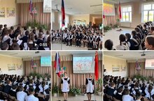 Сегодня в нашей школе прошла церемония поднятия Государственного флага России и Знамени Победы. Провели единый урок"Разговоры о важном" на тему "День Победы. Бессмертный полк".
