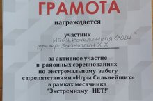 12 нче сентябрь көнне Арча стадионында "Экстремизмга - ЮК!" айлыгы кысаларында төрле каршылыклары булган экстремаль йөгерү буенча район ярышлары булып узды. Безнең мәктәптән бу ярышларда 8 нче сыйныф укучысы Гыйлметдинова Адилә, 9 нчы сыйныф укучылары Мортазин Ильяр белән Валиахметов Дияз катнаштылар. Һәр мәктәптән килгэн командалар 8 этаптан торган каршылыклар полосасын үттеләр. Үтү вакытлары исәпкә алынды. Актив катнашканы өчен команда грамота белән бүләкләнде. Тренерлары Зайнуллин Хәйдәр Хәйруллович. Молодцы!