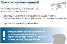 БПЛА һөҗүме очрагында пилотсыз очкычлар очышының видеоларын халыкка җиткерергә ярамый. Бу турыда кисәтүләр булып тора. Һәм һава һөҗүменә каршы оборона эшләү видеосын интернет киңлекләренә урнаштырмау мөһим. Бу аларның урнашу урыннарын ача һәм Татарстан Республикасы гражданнарының иминлегенә куркыныч тудыра. Әгәр дә сез күктә шикле объектны күрсәгез - аның турында 112 телефоны яки “Радар.НФ” кушымтасы аша хәбәр итәргә мөмкин. Шулай эшләгәндә, мәгълүмат ашыгыч хезмәтләргә керәчәк. “Радар.НФ” сайтына күчү өчен сылтама: https://onf.ru/radar?ysclid=m64ljs4ned938745118 Исегезгә төшерәбез, БПЛА һөҗүме куркынычы булганда үзеңне ничек тотарга кирәклеге турында белешмәлек Татарстан Республикасы Террорчылыкка каршы комиссия аппараты сайтында “Гражданнарга тәкъдимнәр” бүлегендә урнаштырылган: https://antiterror.tatarstan.ru/rekomendatsii-grazhdanam.htm