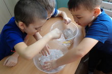 Тәҗрибә үткәрү: "Кайсы тизрәк эри: кармы, бозмы?". Максат: 1. Табигатькә сакчыл караш тәрбияләү. 2. Яз турында белемнәрен мөстәкыйль эшчәнлектә иҗади куллана белү күнекмәләрен үстерү. 3. Яз, аның билгеләре турында белемнәрен киңәйтү.