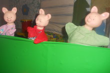 Максат.Әкиятне сәхнәләштереп без балаларда Ниф-ниф,Нуф-Нуф,Наф-Наф кебек эш сөючәнлек һәм бер-береңә ярдәмчеллек сыйфатлары тәрбиялибез.Пәрдә артында курчакларның уйнаганын күреп балаларда шатлык хисләрен күрү безнең күңелләребезне сөендерде.Курчак театры аларга бик ошады.