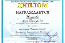 С 18 по 23 апреля 2016 года в городе Королёве, Московской области прошла Семнадцатая Всероссийская Олимпиада «Созвездие-2016» научно-исследовательских и учебно-исследовательских проектов детей и молодежи по проблемам защиты окружающей среды «Человек– Земля – Космос». На финальную часть Олимпиады была приглашена и ученица 8 класса нашей школы Юсупова Аида. Она заняла 4 место в номинации «Энергия и человек». Поздравляем Юсупову Аиду и подготовившего к олимпиаде учителя физики Гильмизянова Рафиля Нуретдиновича и желаем им дальнейших успехов!