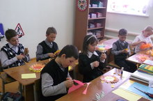 Как можно встретить День Победы? Только улыбкой! Так и собираются сделать наши ученики начальных классов. (Идет подготовка к выставке "Улыбнемся победе" : ученики местерят разные медели солнышек)