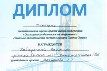 «Экологическая безопасность в ракурсе Хартии Земли» 15.04.2018 На Республиканской научно-практической конференции «Экологическая безопасность современных социально-экономических систем в ракурсе Хартии Земли» наша ученица 8 класса Набиуллина Камиля Ренатовна заняла 3 место (руководитель Маннанова Л.Р.). Поздравляем!