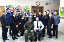 Безнең мәктәптә хәрби-патриотик тәрбия бирүгә зур әһәмият бирелә. Бу юнәлештәге эш бездә ел дәвамында үткәрелә. Шушы уңайдан, 9-11 нче сыйныф укучылары өчен түгәрәк өстәлгә авылдашыбыз Гафиятуллин Нурислам абый чакырылды. Ул Совет Армиясе сафларында Прибалтикада водолаз булып хезмәт итә. Хезмәт итү дәверендә взвод командиры Нурислам абыйның осталыгын, кыюлыгын, батырлыгын күреп алып, прапорщиклар хәзерли торган курсларда укырга тәкъдим итә. Аңа Германия, Куба илләрендә прапорщик булып хезмәт итәргә туры килә. Бу очрашу укучыларыбыз өчен бик файдалы булды. Алар чын ир-егет әлеге тормыш мәктәбен үтәргә тиешлеген яхшы аңладылар.