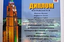 Арча шәһәренең сәнгать мәктәбендә узган Бөек Җиңүнең 80 еллыгына, Ватанны саклаучылар елына багышланган "Арча йолдызлары" исемле конкурс-фестивалендэ безнең балалар бакчасыннан "Бәхет өчен" дигән җыр белән катнашып, Иванова Милана, Мифтахов Хәлим, Шакирова Сафия I дэрэжэдэге дипломант иялэре булдылар. Котлыйбыз!!!