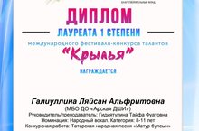 Арча балалар сәнгать мәктәбенең вокал бүлеге укучысы Галиуллина Ләйсән Халыкара "Канатлар" бәйге-фестивалендә (дистанцион, Санкт-Петербург шәһәре) беренче һәм өченче лауреат дипломнарына лаек булды. Җитәкчесе Гидиятуллина Т.Ф.