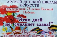28, 29 апреля в г. Казани проходил IX Международный конкурс-фестиваль детско-юношеского и молодежного творчества «Виктория», посвященный 73-й годовщине победы в Великой Отечественной войне. Активное участие в конкурсе приняли учащиеся Арской детской школы искусств.