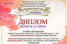 Поздравляем оркестр народных инструментов под руководством Альмиры Фахрутдиновой и ансамбль преподавателей - солист Артур Хафизов Артур Хафизов , руководитель Назир Фахрутдинов с дипломами лауреата I степени Международного конкурса-фестиваля "Горизонты", г. Санкт-Петербург. Желаем дальнейших творческих высот и ярких побед!