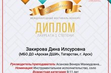Арча балалар сәнгать мәктәбенең фортепиано классы укучысы Закирова Динә (укыт. Асанова В.М.) "Дарование" бәйге-фестивалендә уңышлы чыгыш ясап I дәрәҗә лауреат исеменә лаек булды. Котлыйбыз. -