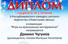 Арча балалар сәнгать мәктәбенең "классик гитара" белгечлеге буенча музыка бүлеге укучысы Чугунов Даниил "Яңа ел йолдызлары" II Республика бәйгесендә уңышлы чыгыш ясап III дәрәҗә лауреат исеменә лаек булды. Укытучысы Алеева М.Т. Котлыйбыз! -