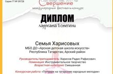 Арча балалар сәнгать мәктәбе укучылары "Свершение" Халыкара бəйге-фестивалендә уңышлы чыгыш ясап лауреат исеменә лаек булдылар. Җитәкчеләре Харисов Р.Р., Харисова Ч.Ф.