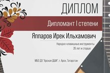 Арча балалар сәнгать мәктәбе укытучысы Яппаров Ирек Илһам улы Халыкара "SOLO-FOLK" бәйгесендә уңышлы чыгыш ясап дипломант исеменә лаек булды.