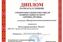 Арча балалар сәнгать мәктәбе укучысы Шәмсетдинов Әмир, "Былбыл" укучылар фольклор коллективы, "Ятаган" укытучылар фольклор ансамбле һәм укытучы Гәйнетдинов Альберт Салах улы Буа шәһәрендә үткән (дистанцион) "Хоровод дружбы" фестивалендә уңышлы чыгыш ясап I дәрәҗә лауреат исеменә лаек булдылар.