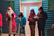 Дед Мороз со Снегурочкой встречают всех у входа в колледж.