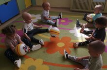 Малыши с удовольствием играли с мячами, собирали мячи в обручи. Поиграли в игру «Догони мяч»: нужно было прокатить мяч вперёд и догнать его.