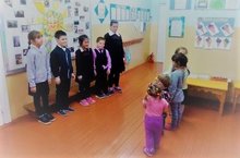 Каникуллар тәмамланды,яңадан мәктәпләргә җыелдык. Без башлангыч класс укучылары белән балалар бакчасына кунакка кердек. Тәрбияче Алинә апалары белән балалар безне шатланышып каршы алдылар. Беренче класс укучылары мәктәп тормышы турында сөйләделәр. Ә нәни дусларыбыз үзләренең эшләре, уеннары, ничек итеп бәйрәмгә хәзерләнүләре турында матур итеп сөйләп бирделәр. Ахырдан табышмакларга җаваплар таптылар, шигырьләр укыдылар.